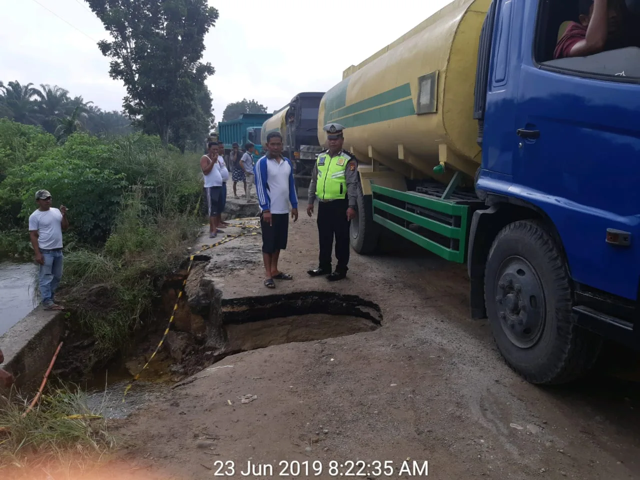 Panit Lantas Polsek Tapung Ipda Rusman yang mendatangi lokasi jalan rusak dan melaporkan bahwa kerusakan berupa amblasnya sebagian badan jalan sehingga tidak bisa dilewati kendaraan besar atau kendaraan berat.