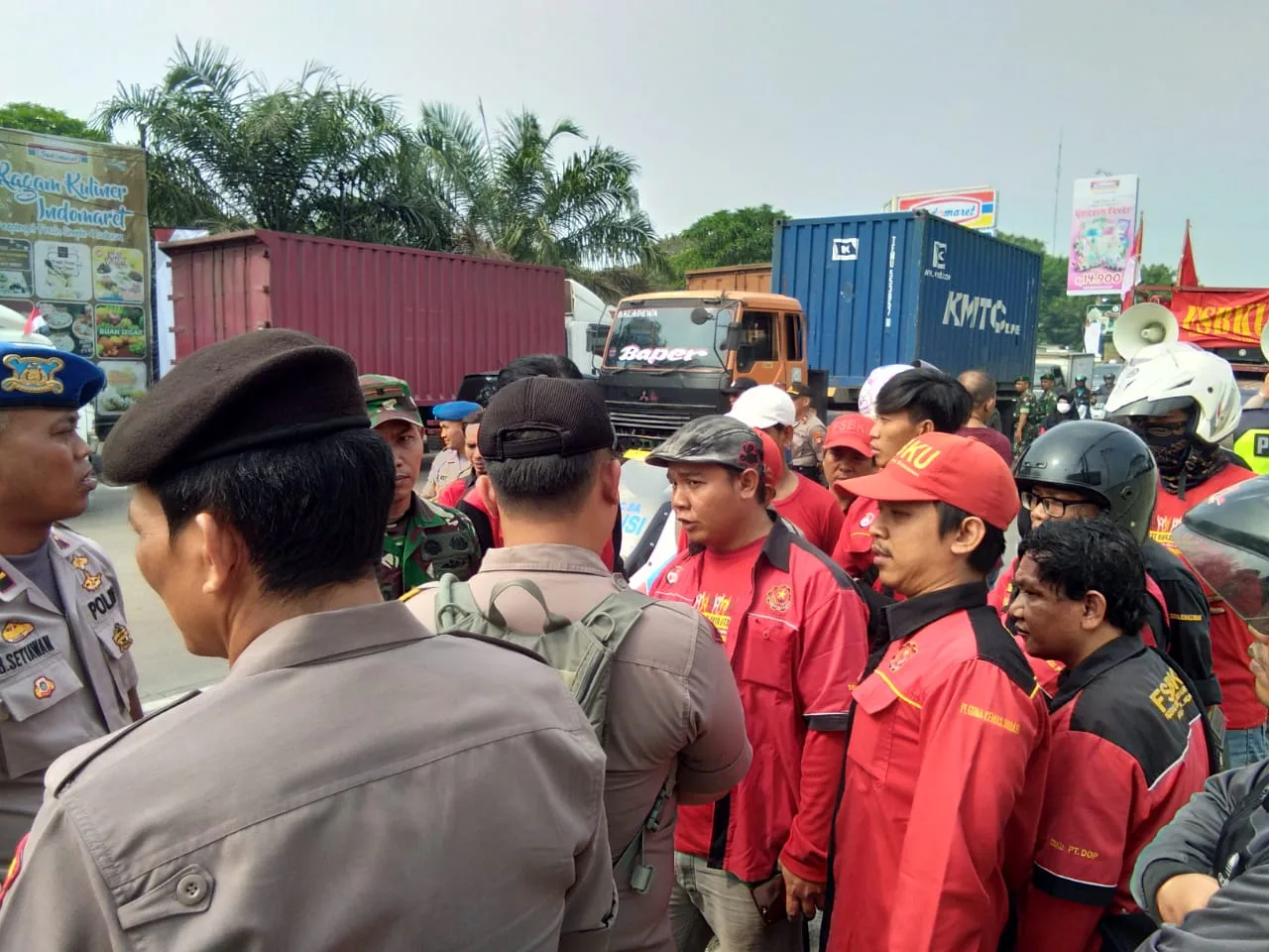 Bukan hanya polisi, anggota TNI juga terlibat dalam penghadangan massa aksi seperti yang terjadi di Bitung, Kabupaten Tangerang. Mereka menyetop iring-iringan sepeda motor buruh dan melarang peserta aksi melanjutkan perjalanan.