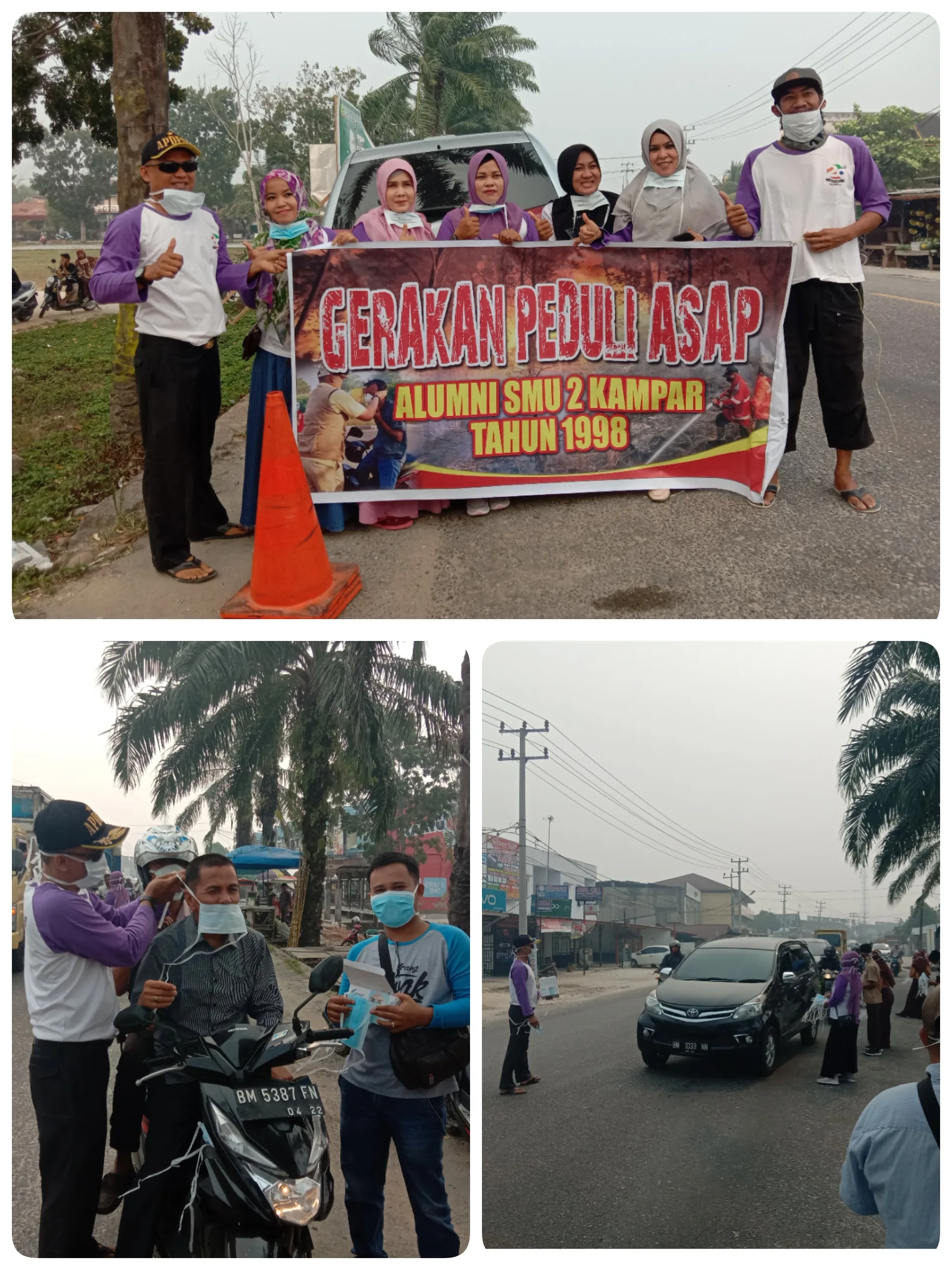 Kampar, (cMczone.com) –Peduli dengan makin pekatnya kabut asap di Kabupaten Kampar dan meningkatnya penderita ISPA, Ikatan Alumni Sekolah Menengah Atas Negeri Dua (2) Kampar yang sekarang SMAN 1 Kampar bagi-bagi masker kepada masyarakat.