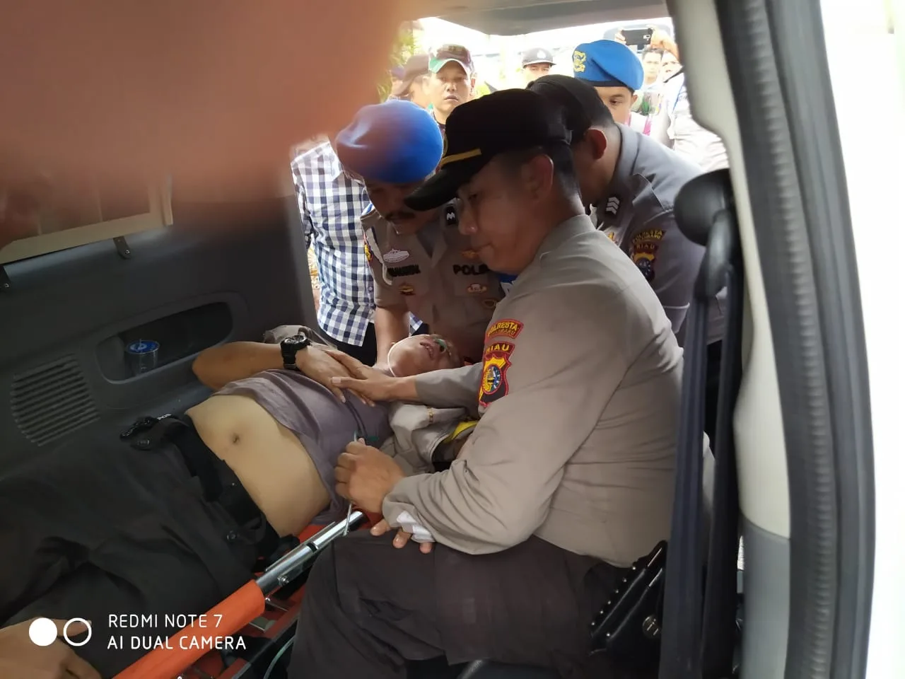 Terlihat Kapolres digotong ke dalam mobil ambulans kemudian dibawa ke rumah sakit.