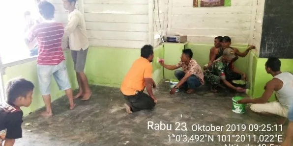 Babinsa Kampung Jambai makmur Kecamatan Kandis Kabupaten Siak, Koptu Roni P, bersama Masyarakat melaksanakan giat gotong royong Renofasi dan pembersihan di tempat Ibadah (Musholla) Al Hidaya di Dusun Lubuk raya Rt.02/02, Kampung Jambai makmur, Kecamatan Kandis, Kabupaten Siak. Rabu (23/10/19).