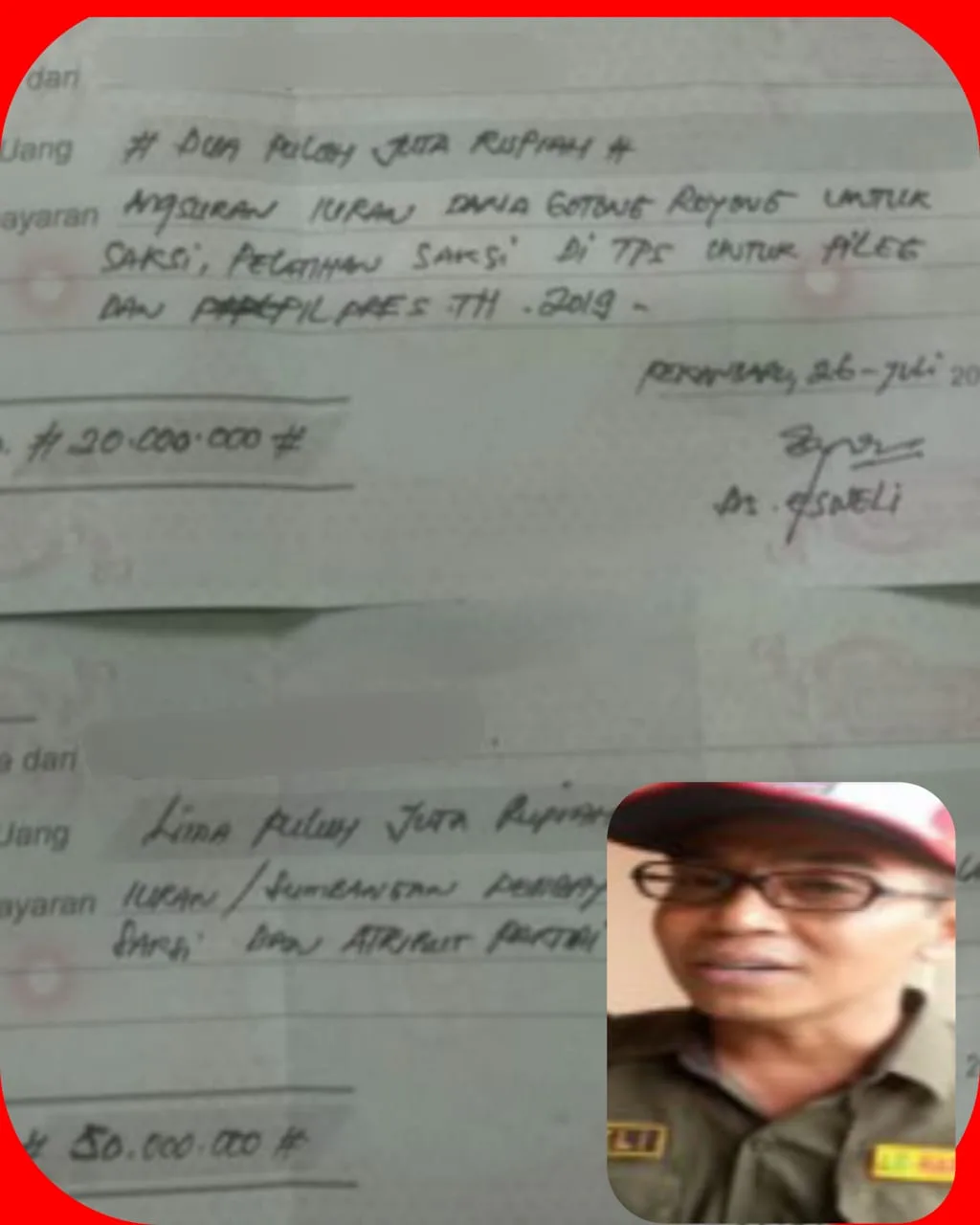 Adapun rumor dan bukti kwitansi penerimaan uang sebesar Rp 70.000.000, diduga dilakukan untuk pembayaran Angusaran Iuran dana Gotongroyong Saksi,Pelatihan Saksi dan Atribut Partai oleh Caleg pada Juli 2018 lalu.