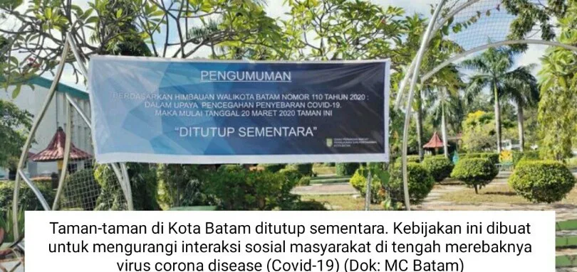 “Sesuai arahan Pak Walikota Batam, masyarakat diminta untuk melakukan social distancing, mengurangi kegiatan berkumpul di tempat umum. Jadi beberapa taman yang kerap dikunjungi masyarakat Kota Batam ditutup sementara,” kata Kepala Dinas Perumahan Rakyat, Permukiman, dan Pertamanan Kota Batam, Eryudhi Apriadi di Sekupang, Senin (23/3/2020).