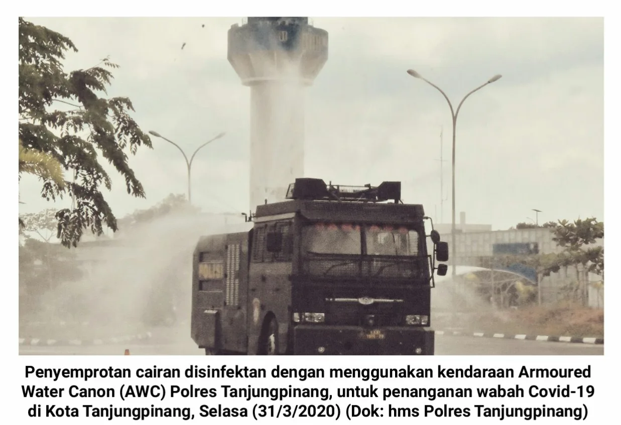 Tanjungpinang, (cMczone.com) – Bukti nyata keseriusan penanganan wabah Virus Corona (Covid-19) yang mewabah di dunia, seluruh jajaran Kepolisian Republik Indonesia (Polri) di Indonesia bersama TNI dan pemerintah serentak melaksanakan penyemprotan cairan disinfektan di berbagai wilayah, Selasa (31/3/2020).