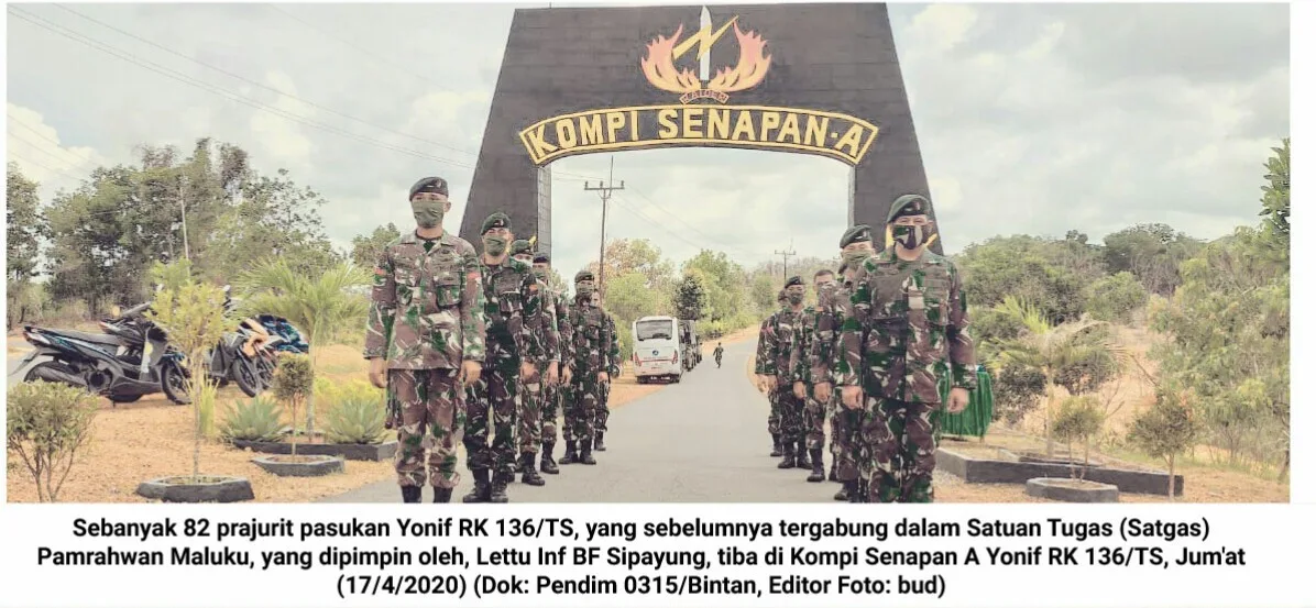Bintan, Kepri (cMczone.com) – Sebanyak 82 prajurit pasukan Yonif RK 136/TS, yang sebelumnya tergabung dalam Satuan Tugas (Satgas) Pamrahwan Maluku, yang dipimpin oleh, Lettu Inf BF Sipayung, tiba di Kompi Senapan A Yonif RK 136/TS, di Kelurahan Tembeling, Kecamatan Teluk Bintan, Kabupaten Bintan, Provinsi Kepulauan Riau (Kepri), Jumat (17/4/2020).