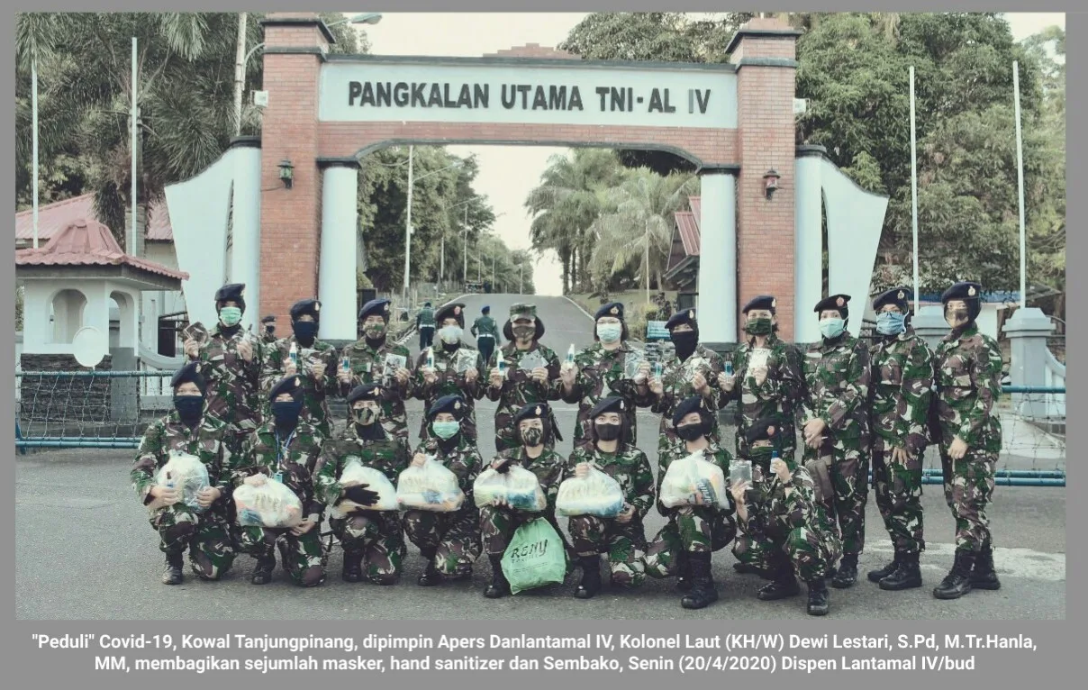 Tanjungpinang, Kepri (cMczone.com) – Segenap prajurit Korps Wanita Angkatan Laut (Kowal) Tanjungpinang, yang dipimpin Asisten Personil Komandan Pangkalan Utama TNI Angkatan Laut (Apers Danlantamal IV), Kolonel Laut (KH/W) Dewi Lestari, S.Pd, M.Tr.Hanla, MM, membagikan sejumlah masker, hand sanitizer dan Sembako, Senin (20/4/2020).