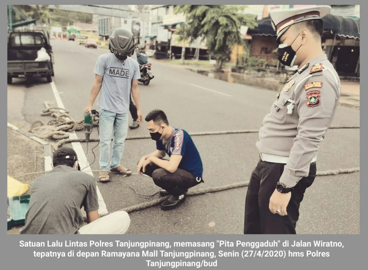 Tanjungpinang, Kepri (cMczone.com) – Satuan Lalu Lintas Kepolisian Resor (Polres) Tanjungpinang memasang “Pita Penggaduh” di Jalan Wiratno, tepatnya di depan Ramayana Mall Tanjungpinang, Senin (27/4/2020).