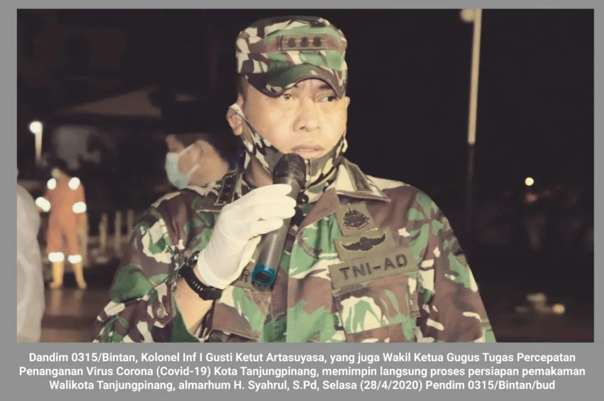 Komandan Distrik Militer (Dandim) 0315/Bintan, Kolonel Inf I Gusti Ketut Artasuyasa, yang juga Wakil Ketua Gugus Tugas Percepatan Penanganan Virus Corona (Covid-19) Kota Tanjungpinang, memimpin langsung proses persiapan pemakaman bagi almarhum H. Syahrul, S.Pd.