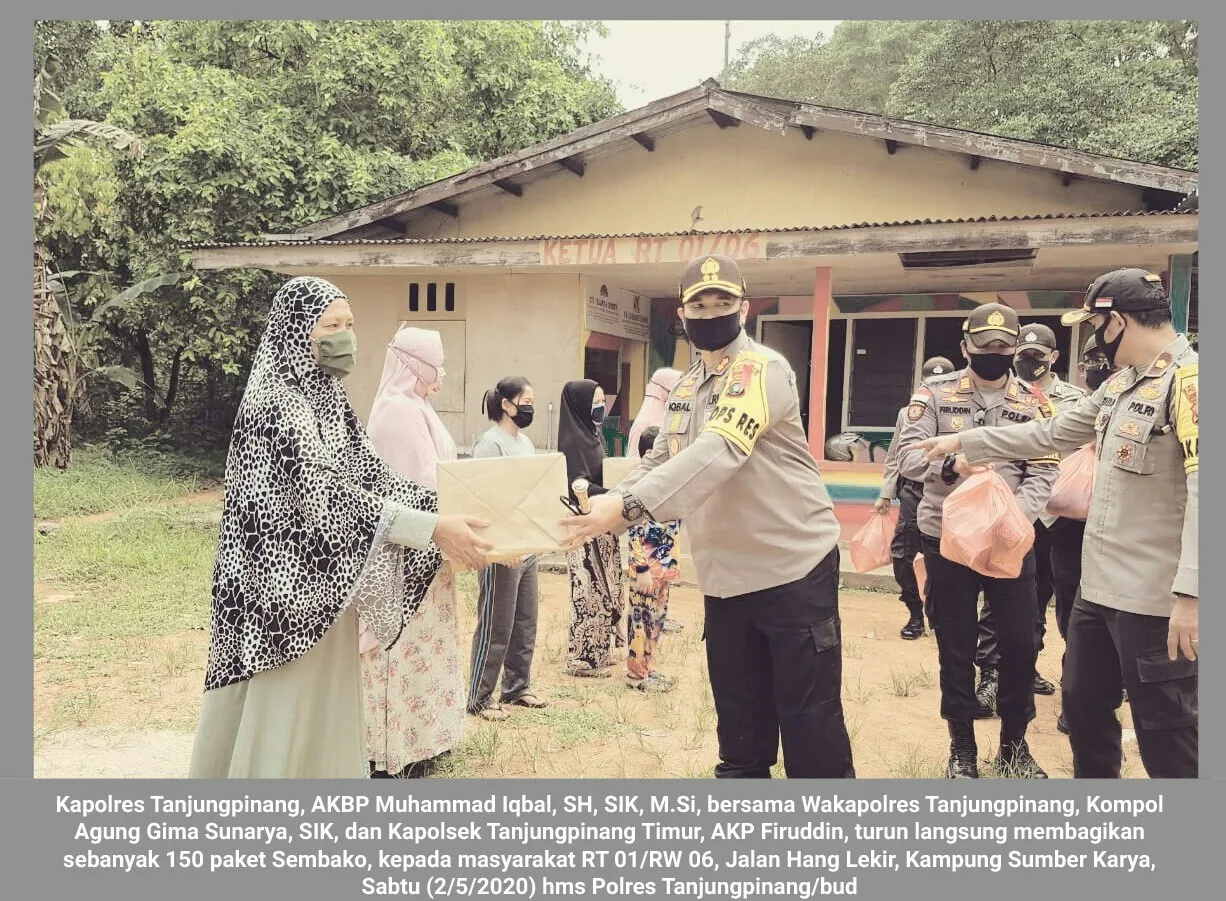 Sabtu (2/5/2020), Kapolres Tanjungpinang, AKBP Muhammad Iqbal, SH, SIK, M.Si, bersama Wakapolres Tanjungpinang, Kompol Agung Gima Sunarya, SIK, turun langsung membagikan sebanyak 150 paket Sembako, kepada masyarakat, bertempat di rumah Ketua RT 01/RW 06, Jalan Hang Lekir, Kampung Sumber Karya, Kelurahan Batu IX, Kota Tanjungpinang, Provinsi Kepulauan Riau (Kepri).