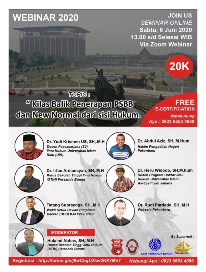 RIAU – Ikuti segera Seminar Online dengan mengusung topic” Kilas Balik Penerapan PSBB dan New Normal dari sisi Hukum.