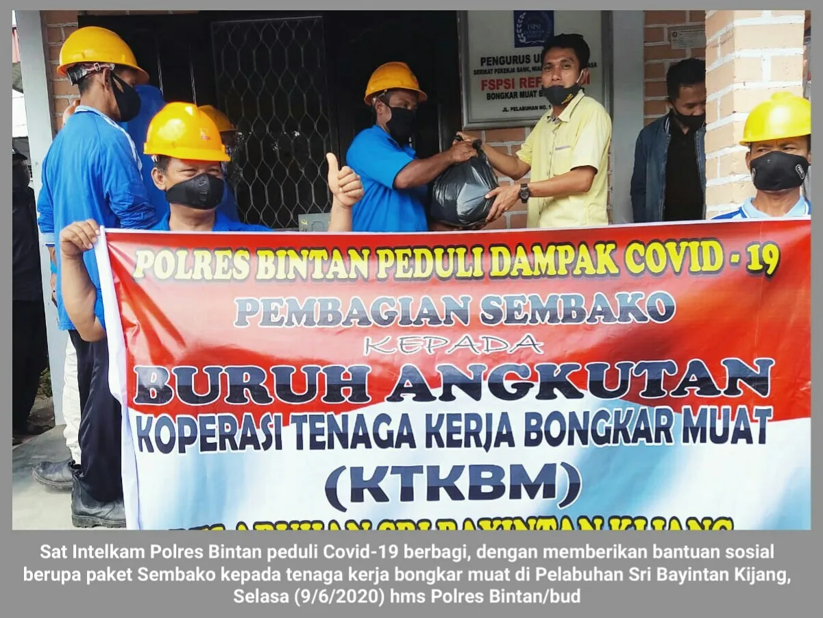 Bintan, Kepri (cMczone.com) – Sat Intelkam Polres Bintan peduli Covid-19 berbagi, dengan memberikan bantuan sosial berupa paket Sembako kepada tenaga kerja bongkar muat di Pelabuhan Sri Bayintan Kijang, Kecamatan . Bintan Timur, Kabupaten Bintan, Provinsi Kepulauan Riau (Kepri), Selasa (9/6/2020) sore.