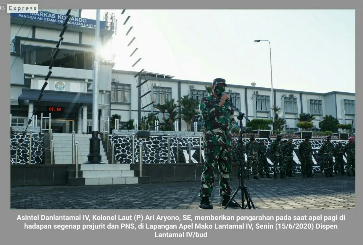 Tanjungpinang, Kepri (cMczone.com) – Asisten Intelijen Komandan Pangkalan Utama TNI Angkatan Laut (Asintel Danlantamal) IV, Kolonel Laut (P) Ari Aryono, SE, memberikan pengarahan pada saat apel pagi di hadapan segenap prajurit dan Pegawai Negeri Sipil (PNS) Lantamal IV di Lapangan Apel Markas Komando (Mako) Lantamal IV, Jalan Yos Sudarso, No.1, Batu Hitam, Kota Tanjungpinang, Provinsi Kepulauan Riau (Kepri), Senin (15/6/2020).
