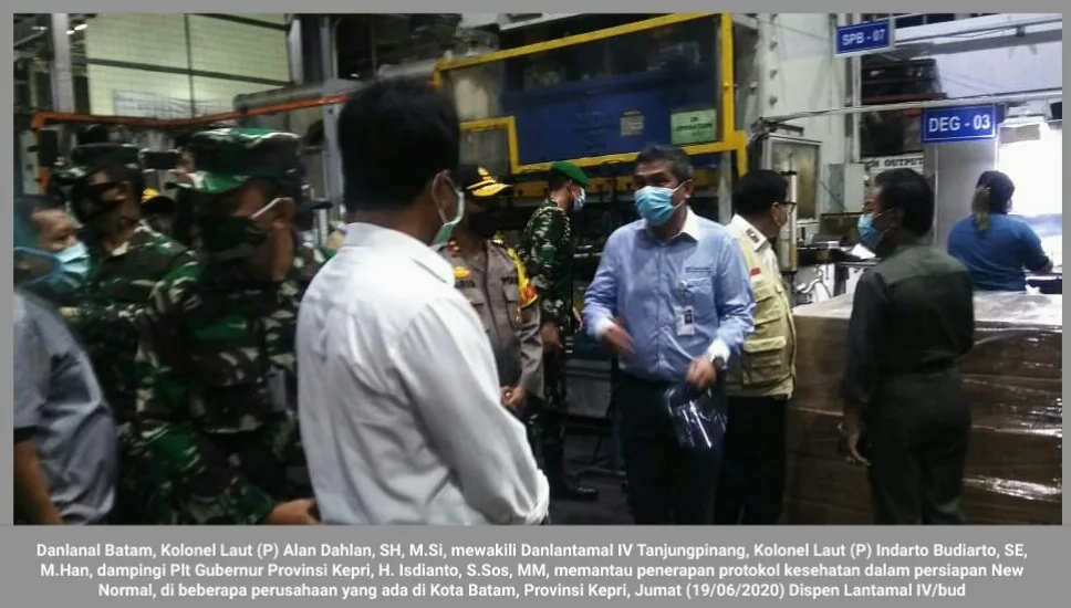 Batam, Kepri (cMczone.com) – Komandan Pangkalan TNI Angkatan Laut (Lanal) Batam, Kolonel Laut (P) Alan Dahlan, SH, M.Si, mewakili Komandan Pangkalan Utama TNI Angkatan Laut (Danlantamal) IV Tanjungpinang, Kolonel Laut (P) Indarto Budiarto, SE, M.Han, dampingi Pelaksana Tugas (Plt) Gubernur Provinsi Kepulauan Riau (Kepri), H. Isdianto, S.Sos, MM, memantau penerapan protokol kesehatan dalam persiapan New Normal, di beberapa perusahaan yang ada di Kota Batam, Provinsi Kepri, Jumat (19/06/2020).