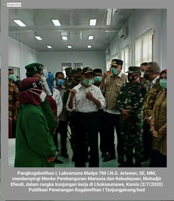 Lhokseumawe, Aceh (cMczone.com) – Pangkogabwilhan I, Laksamana Madya TNI I.N.G. Ariawan, SE, MM, ikut mendampingi Menko Pembangunan  Manusia dan Kebudayaan, Muhadjir Efendi, dalam rangka kunjungan kerja di Lhokseumawe, Kamis (2/7/2020).