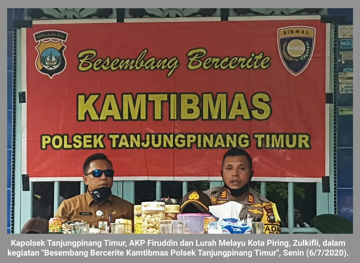 Tanjungpinang, Kepri (cMczone.com) –Kepolisian Sektor (Polsek) Tanjungpinang Timur yang dipimpin AKP Firuddin bersama Lurah Melayu Kota Piring, Zulkifli, seluruh Ketua RW dan tokoh masyarakat berkumpul di kediaman Basuki yang merupakan tokoh masyarakat sekaligus Ketua RW 04, Kelurahan Melayu Kota Piring, Kecamatan Tanjungpinang Timur, Kota Tanjungpinang, Provinsi Kepulauan Riau (Kepri), dalam kegiatan “Besembang Bercerite Kamtibmas Polsek Tanjungpinang Timur”, Senin (6/7/2020) siang.
