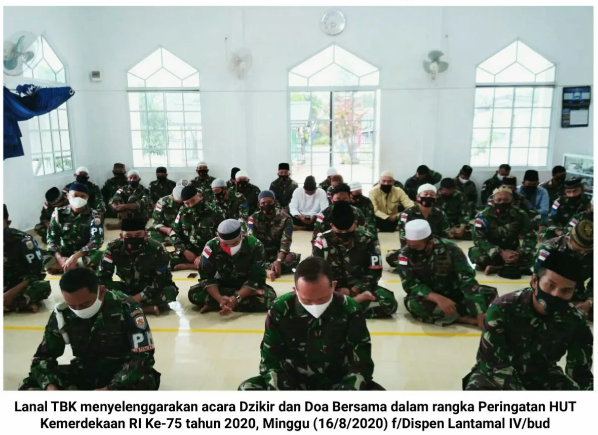 “Peringatan HUT Ke-75 RI tahun ini dihadapkan dengan pandemi Covid-19, sehingga diselenggarakannya Dzikir dan Doa Bersama dimaksudkan sebagai wujud syukur atas kemerdekaan RI dan semoga bangsa Indonesia lekas dibebaskan dari pandemi Covid-19,” ujar Danlanal TBK, Letkol Laut (P) Mandri Kartono, MM.