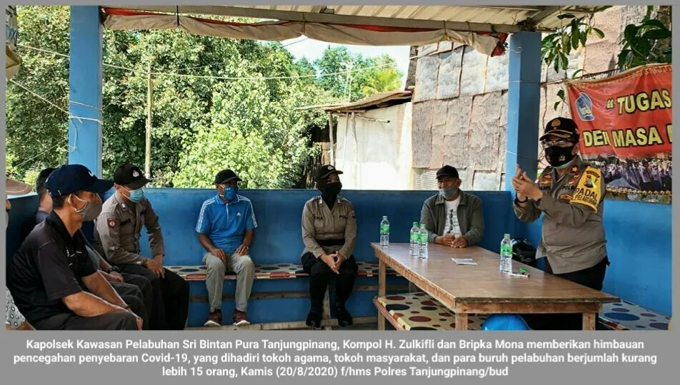 Kapolsek Kawasan Pelabuhan Sri Bintan Pura Tanjungpinang, Kompol H. Zulkifli dan Bripka Mona memberikan himbauan pencegahan penyebaran Covid-19, yang dihadiri tokoh agama, tokoh masyarakat, dan para buruh pelabuhan berjumlah kurang lebih 15 orang.