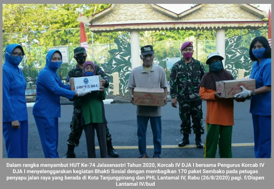 Tanjungpinang, Kepri (cMczone.com) – Dalam rangka menyambut Hari Ulang Tahun (HUT) Ke-74 Jalasenastri Tahun 2020, Koordinator Cabang IV Daerah Jalasenastri Armada I (Korcab IV DJA I) bersama Pengurus menyelenggarakan kegiatan Bhakti Sosial dengan membagikan 170 paket Sembako pada petugas penyapu jalan raya yang berada di Kota Tanjungpinang dan Pegawai Harian Lepas (PHL) Lantamal IV, Rabu (26/8/2020) pagi.