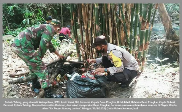 Karimun, Kepri (cMczone.com) – Kepolisian Sektor (Polsek) Tebing, yang diwakili Wakapolsek, IPTU Andri Yusri, SH, bersama Kepala Desa Pongkar, H. M Jahid, Babinsa Desa Pongkar, Kopda Suheri, Personil Polsek Tebing, Mahasiswa Pecinta Alam (Mapala) Universitas Karimun, dan tokoh masyarakat Desa Pongkar, bersama-sama membersihkan sampah di Obyek Wisata Alam “Air Terjun Gunung Jantan” yang terletak di Desa Pongkar, Kecamatan Tebing, Kabupaten Karimun, Provinsi Kepulauan Riau (Kepri), Minggu (30/8/2020).