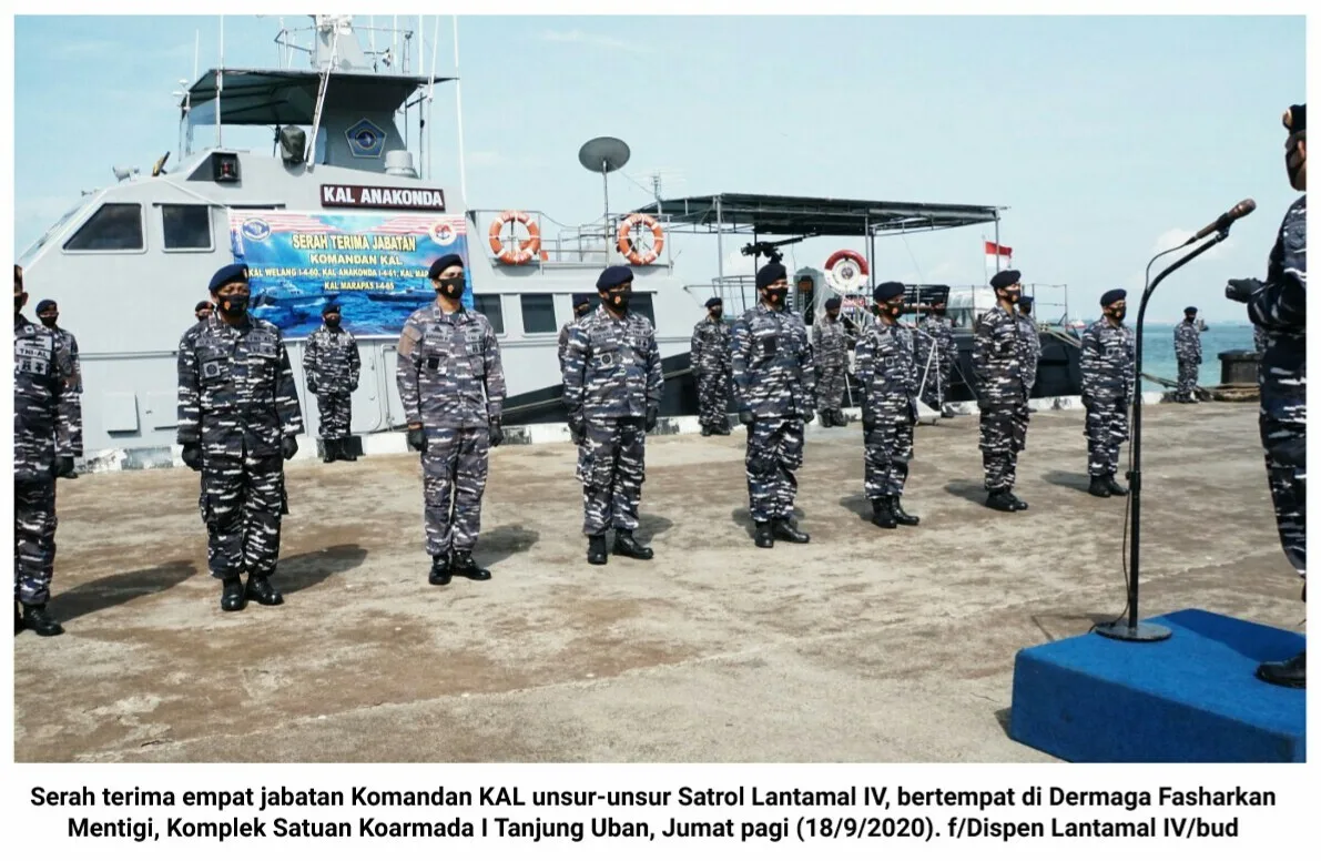 Kemudian jabatan Komandan Kal Anakonda Satrol Lantamal IV dari Kapten Laut (P) Remon Pinem kepada Kapten Laut (P) Hadi Purwanto, kemudian yang terakhir jabatan Komandan Kal Welang Satrol Lantamal IV Tanjungpinang dari Lettu Laut (P) Ray Setha Heri Manggara, ST.Han, kepada Lettu Laut (P) Agustinus.