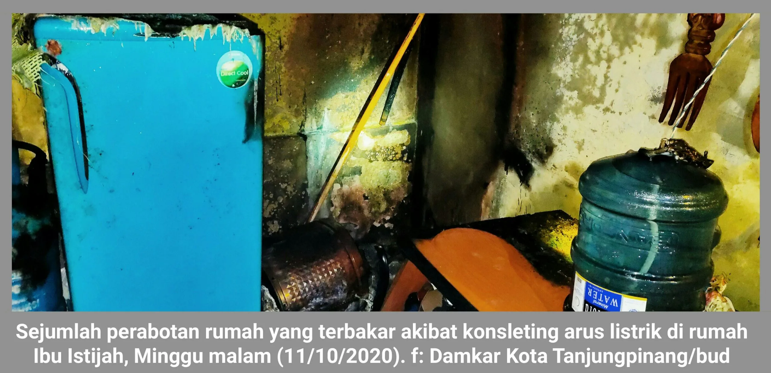 Tanjungpinang, Kepri (cMczone.com) – Telah terjadi kebakaran rumah akibat konsleting arus listrik. Kejadian tersebut dilaporkan oleh RA Mukmin pada petugas Pemadam Kebaran (Damkar) Kota Tanjungpinang pada pukul 21.50 WIB, Minggu (11/10/2020).