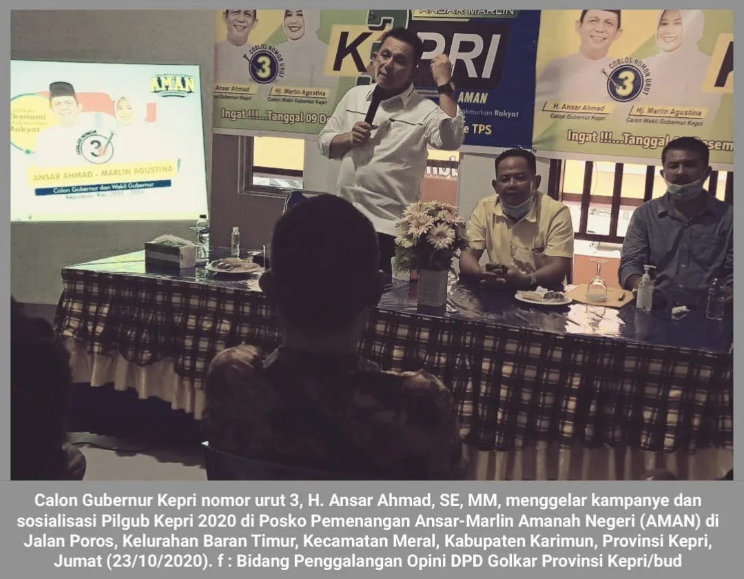 Anggaran APBD harus dipergunakan semaksimal mungkin untuk memenuhi kebutuhan masyarakat. Pernyataan Ansar Ahmad tersebut disampaikan ketika menggelar kampanye dan sosialisasi Pemilihan Gubernur (Pilgub) Kepri 2020 di Posko Pemenangan Ansar-Marlin Amanah Negeri (AMAN) di Jalan Poros, Kelurahan Baran Timur, Kecamatan Meral, Kabupaten Karimun, Provinsi Kepri, Jumat (23/10/2020).