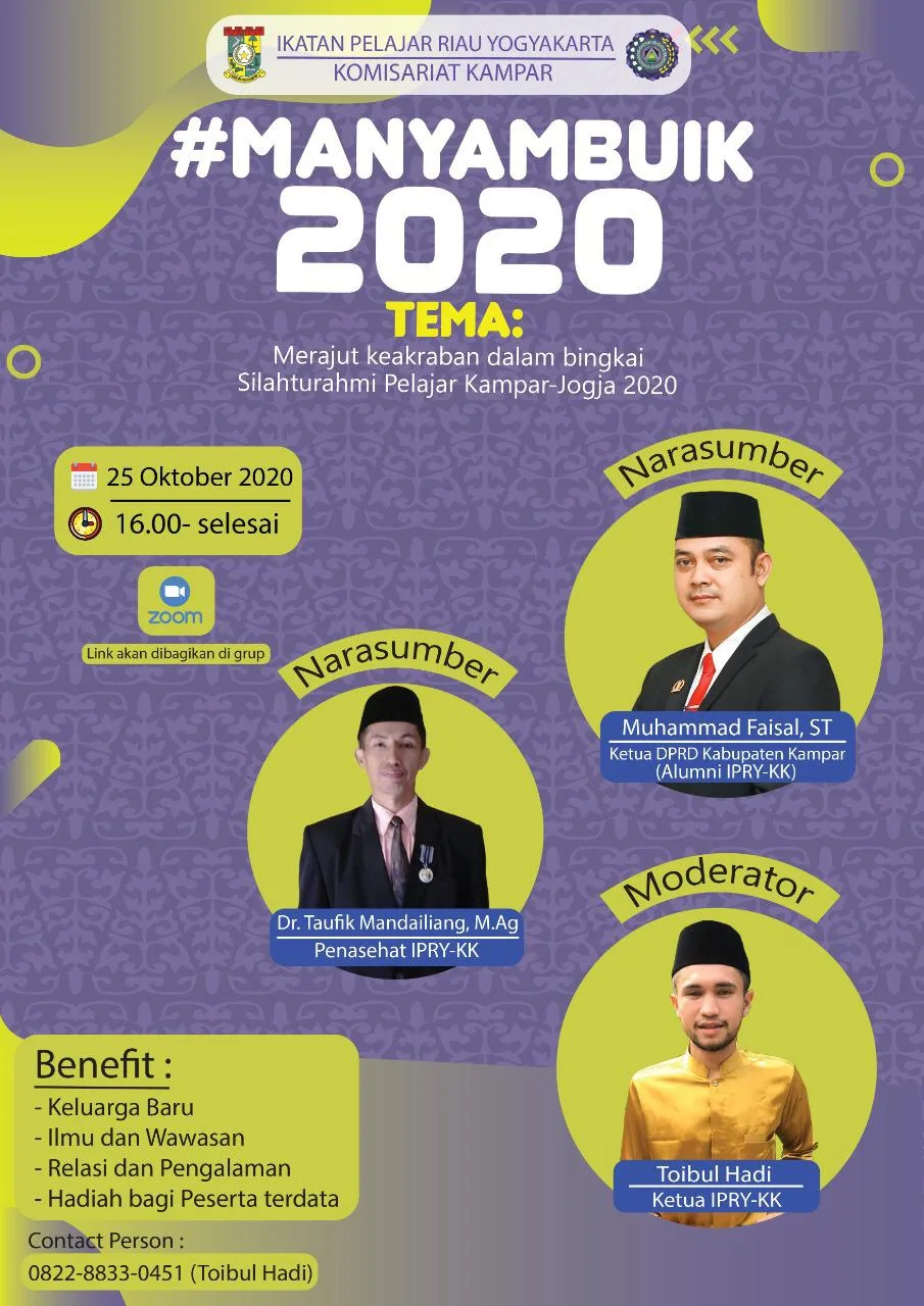 Yogyakarta, (cMczone.com) – Ikatan Pelajar Riau di Yogyakarta Komisariat Kampar (IPRY-KK) sukses melaksanakan acara puncak MANYAMBUIK 2020 dengan Tema “Merajut Keakraban Dalam Bingkai Silaturrahmi Pelajar Kampar-Jogja 2020” yang berlangsung secara online pada Minggu (25/10/2020) via ZOOM.