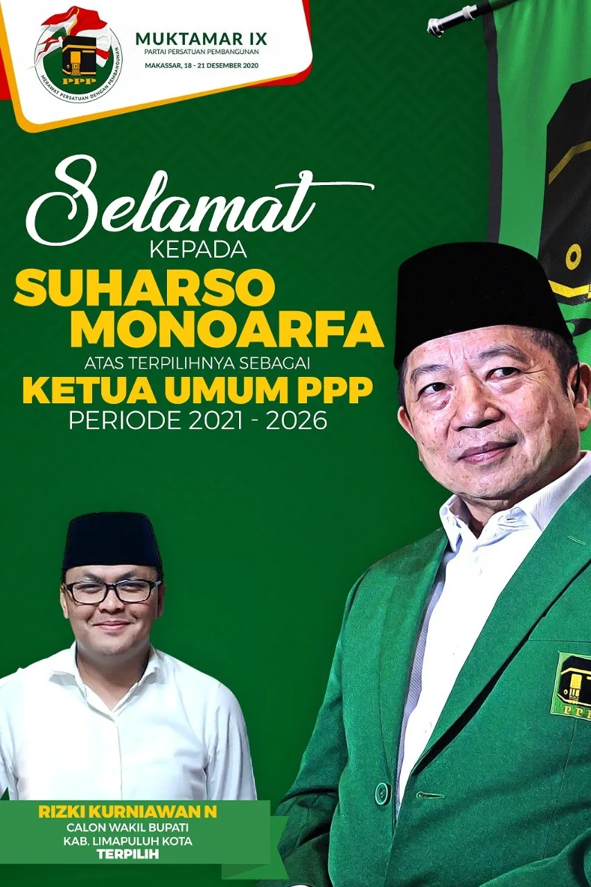 ‘ Kami mengucapkan selamat kepada Bapak Suharso Monoarfa sebagai Ketum terpilih. Semoga AMANAH. Kami doakan beliau mampu memimpin PPP untuk menjadi partai besar pemenang pemilu pada tahun 2024. Kami doakan semoga PPP dibawah kepemimpinan beliau mampu memberikan kontribusi besar dalam membangun INDONESIA ‘ ujar Wakil Bupati Kabupaten 50 Kota terpilih 2021-2025 kepada awak media Via WA , Minggu 20 Desember 2020.