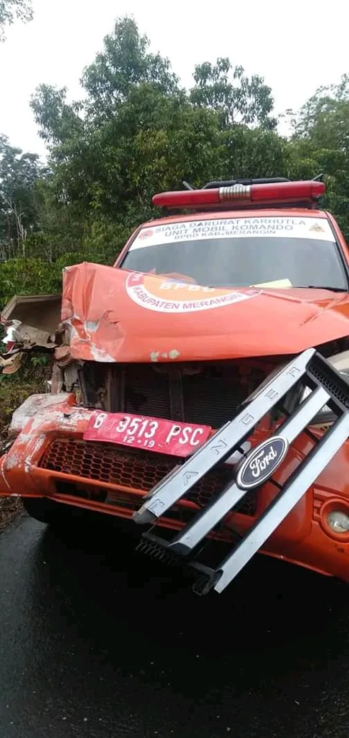 ” kecelakaan tersebut satu unit mobil pickup up bermuatan sayur hendak menuju ke Bangko, berpapasan dengan satu unit mobil Dinas BPBD dari Bangko tujuan ke Depati 4.