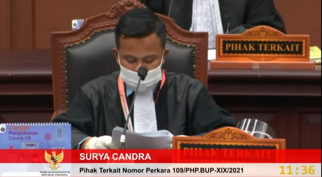 “Pihak terkait memohon kepada yang mulia Mejelis Hakim Mahkamah Konstitusi untuk menjatuhkan putusan, dalam eksepsi mengabulkan eksepsi pihak terkait untuk seluruhnya, menyatakan permohonan pemohon tidak dapat diterima, dalam pokok perkara, menolak permohonan pemohon untuk seluruhnya, menyatakan benar dan tetap berlaku Keputusan Komisi Pemilihan Umum Kabupaten Lima Puluh Kota tentang Penetapan Rekapitulasi Hasil Penghitungan Perolehan Suara,” tutup Surya menyampaikan petitumnya.