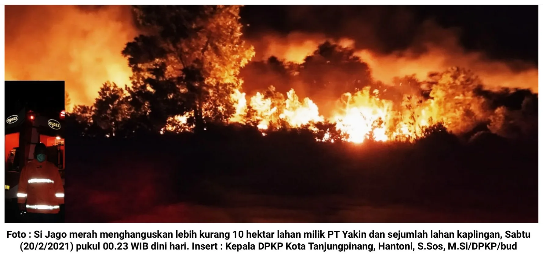 “Diketahui lahan tersebut milik PT Yakin dan sejumlah lahan kaplingan,” ungkap Kepala Dinas Pemadam Kebakaran dan Penyelamatan (DPKP) Kota Tanjungpinang, Hantoni, S.Sos, M.Si pada cMczone.com.