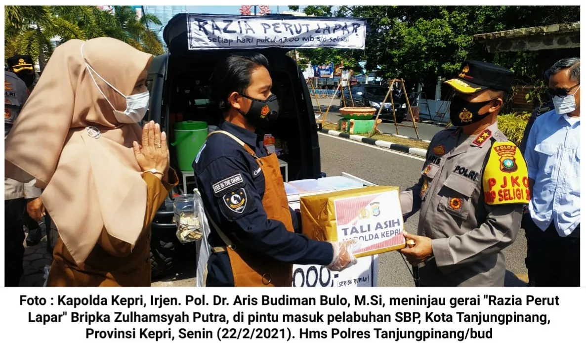 Tanjungpinang, Kepri (cMczone.com) – Kepala Kepolisian Daerah (Kapolda) Kepulauan Riau (Kepri), Irjen. Pol. Dr. Aris Budiman Bulo, M.Si, meninjau langsung gerai “Razia Perut Lapar” yang diinisiasi serta dilakukan oleh Ps Panit Intel Kepolisian Sektor (Polsek) Kawasan Khusus Pelabuhan (KKP) Sri Bintan Pura (SBP), Bripka Zulhamsyah Putra, di pintu masuk pelabuhan SBP, Kota Tanjungpinang, Provinsi Kepri, Senin (22/2/2021) siang.