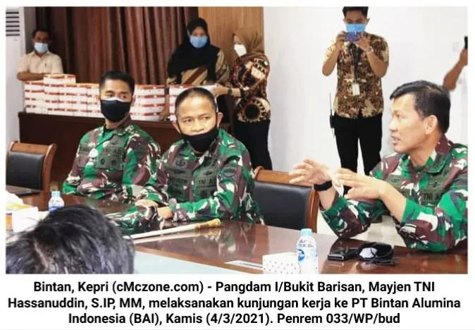Bintan, Kepri (cMczone.com) – Panglima Daerah Militer (Pangdam) I/Bukit Barisan Mayjen TNI Hassanuddin, S.IP, MM, melaksanakan kunjungan kerja ke PT Bintan Alumina Indonesia (BAI), Kamis (4/3/2021).