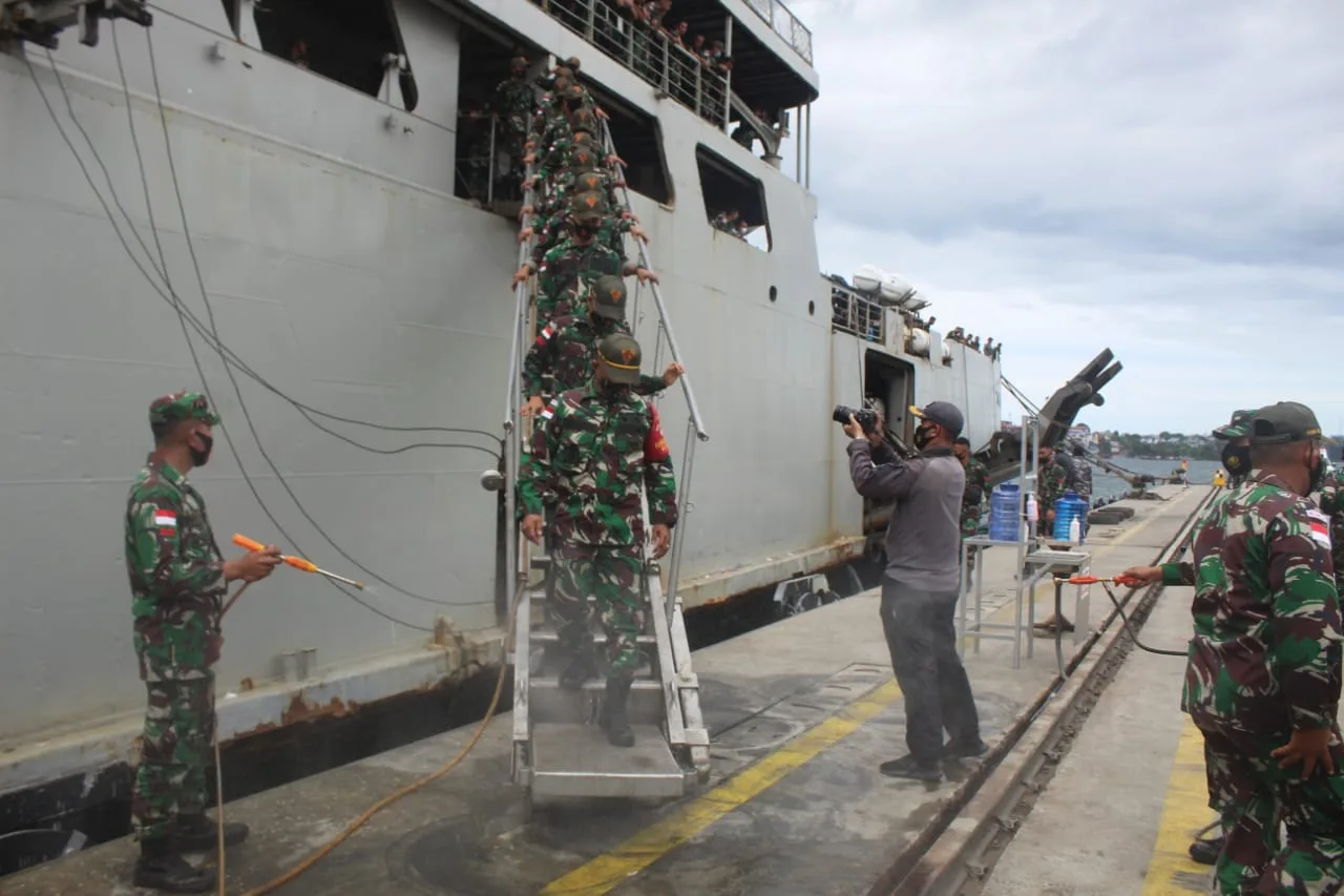Setibanya di Pelabuhan Jayapura, personil TNI sebanyak 450 prajurit Braja sakti tersebut langsung melaksanakan Protkes Covid-19 berupa penyemprotan desinfektan dengan sasaran perlengkapan militer, kemudian dilanjutkan dengan pelaksanaan rapid antigen Covid 19.