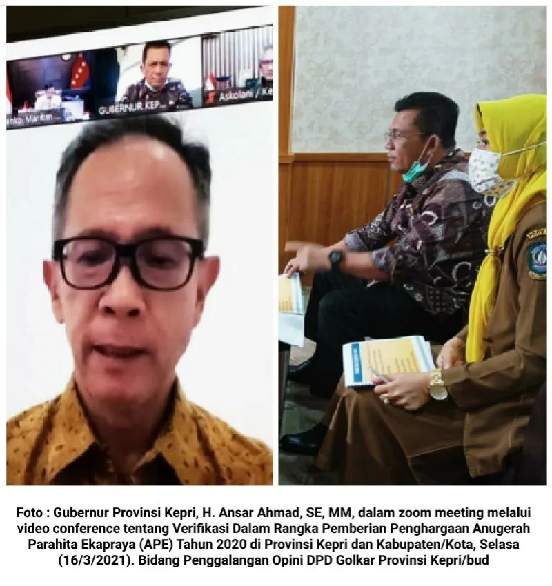 Demikian disampaikan oleh Gubernur Provinsi Kepri, H. Ansar Ahmad, SE, MM, kepada Deputi Bidang Kesetaraan Gender Kementerian Pemberdayaan Perempuan dan Perlindungan Anak, Ir. Agustina Erni MSc, dalam zoom meeting melalui video conference tentang Verifikasi Dalam Rangka Pemberian Penghargaan Anugerah Parahita Ekapraya (APE) Tahun 2020 di Provinsi Kepri dan Kabupaten/Kota, Selasa (16/3/2021).