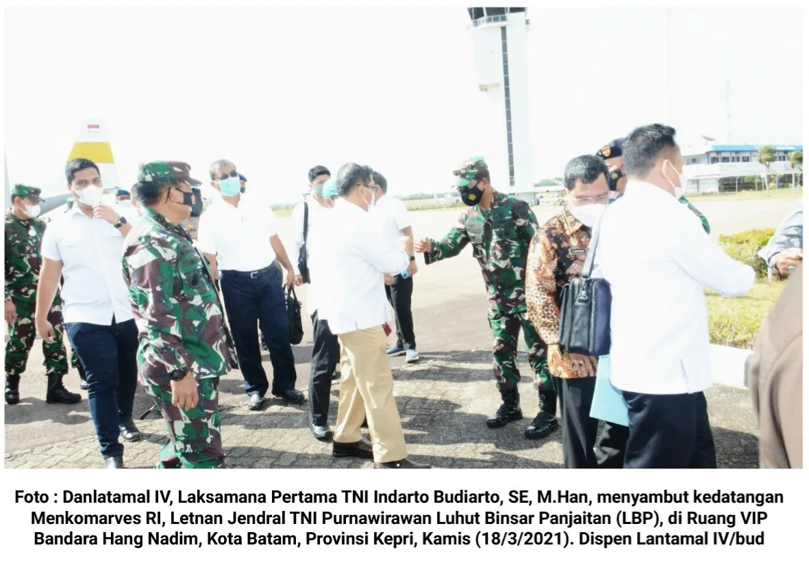 Batam, Kepri (cMczone.com) – Komandan Pangkalan Utama TNI Angkatan Laut IV (Danlatamal IV) Tanjungpinang, Laksamana Pertama TNI Indarto Budiarto, SE, M.Han, bersama Gubernur Provinsi Kepulauan Riau (Kepri), H. Ansar Ahmad, SE, MM, Pangdam I/BB, Mayor Jenderal TNI Hasanudin, S.IP, MM, Panglima Koarmada I, Laksamana Muda TNI Abdul Rasyid K, SE, MM, Unsur Pimpinan FKPD Provinsi Kepri dan unsur Kementerian menyambut kedatangan Menteri Koordinator Maritim dan Investasi RI (Menkomarves RI), Letnan Jendral TNI Purnawirawan Luhut Binsar Panjaitan (LBP), di Ruang VIP Bandara Hang Nadim, Kota Batam, Provinsi Kepri, Kamis (18/3/2021).