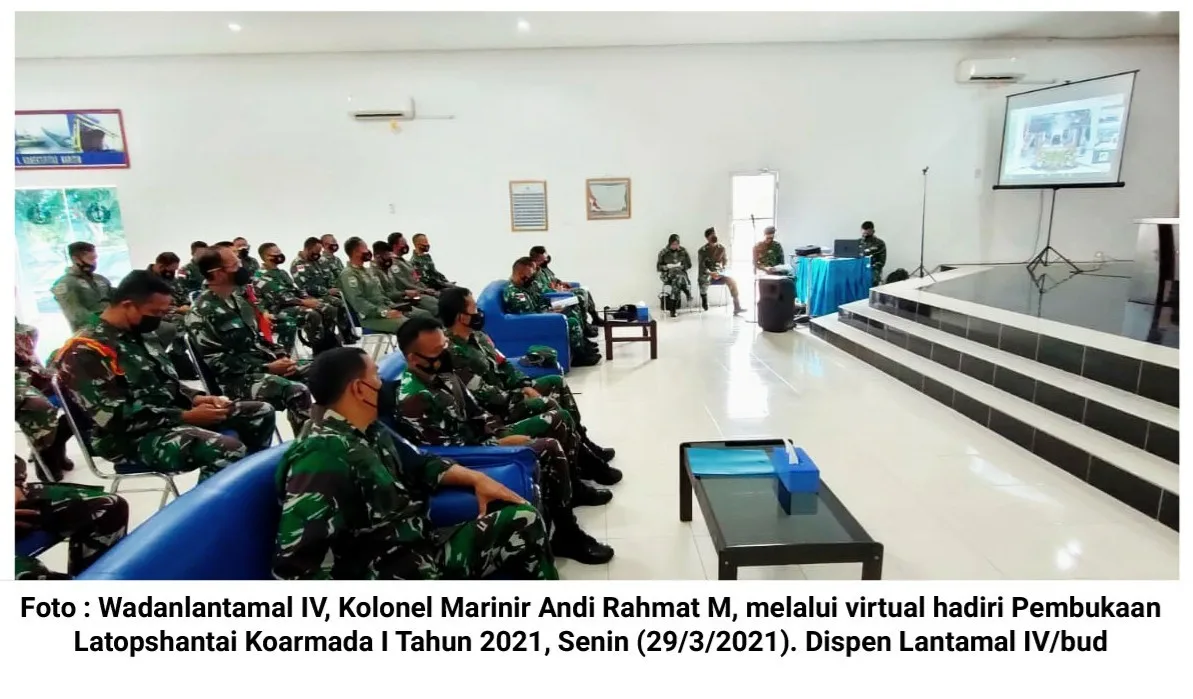 Bintan, Kepri (cMczone.com) – Wakil Komandan Pangkalan Utama TNI Angkatan Laut IV (Wadanlantamal IV) Tanjungpinang, Kolonel Marinir Andi Rahmat M, melalui virtual hadiri acara Pembukaan Latihan Operasi Pertahanan Pantai (Latopshantai) Koarmada I Tahun 2021 yang berlangsung di Gedung Serba Guna (GSG) Fasharkan Mentigi, Tanjung Uban, Kabupaten Bintan, Provinsi Kepulauan Riau (Kepri), Senin (29/3/2021).