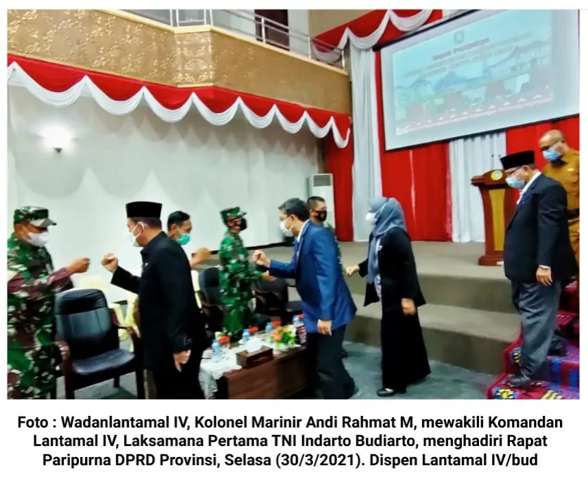 Tanjungpinang, Kepri (cMczone.com) – Wakil Komandan Pangkalan Utama TNI Angkatan Laut IV (Wadanlantamal IV) Tanjungpinang, Kolonel Marinir Andi Rahmat M, mewakili Komandan Lantamal IV, Laksamana Pertama TNI Indarto Budiarto, menghadiri Rapat Paripurna Dewan Perwakilan Rakyat Daerah (DPRD) Provinsi Kepulauan Riau (Kepri) yang berlangsung di Ruang Rapat Sidang Utama DPRD Provinsi Kepri, Dompak, Kota Tanjungpinang, Provinsi Kepri, Selasa (30/3/2021).