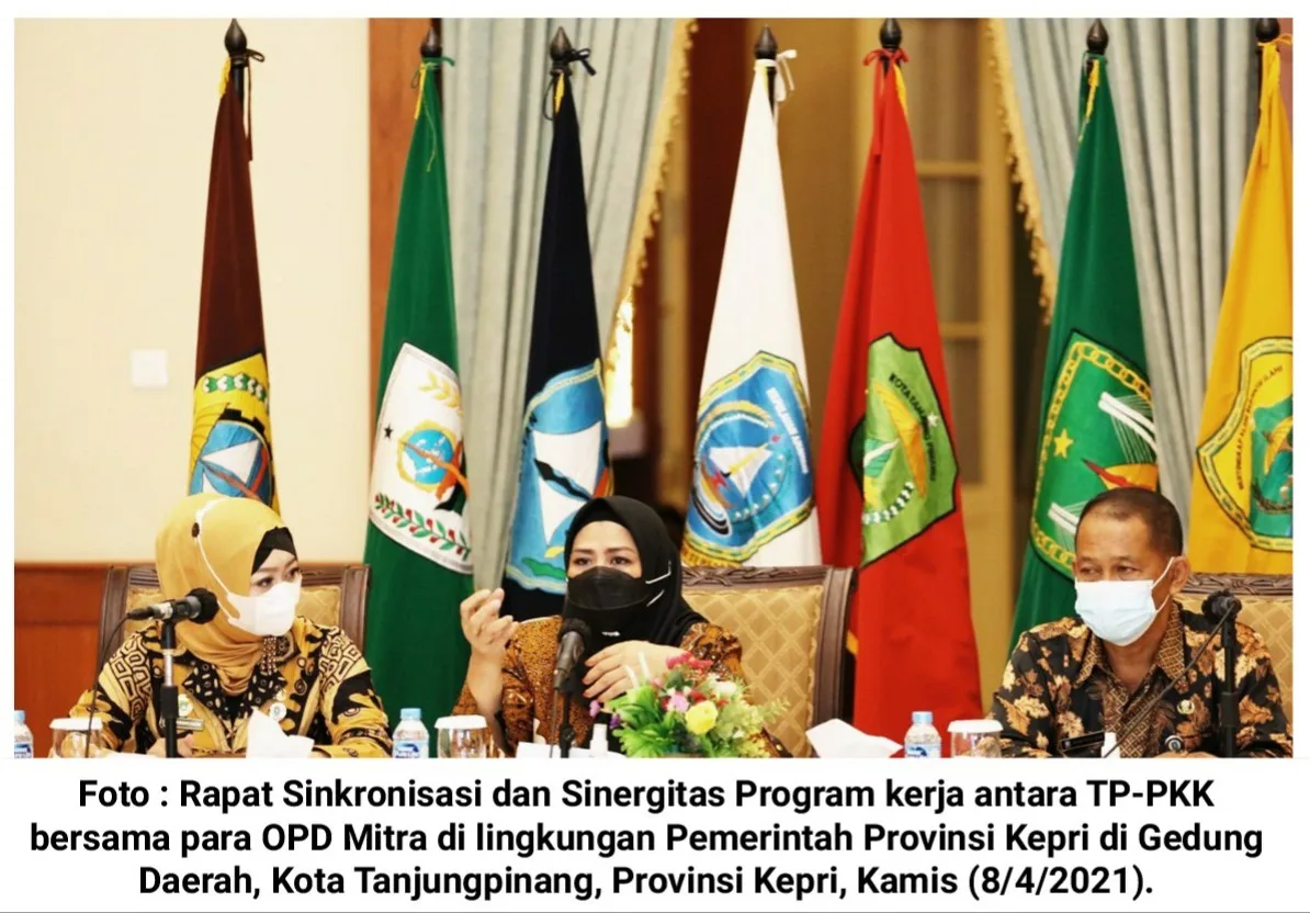 “TP-PKK Kepulauan Riau sebagai mitra kerja Organisasi Perangkat Daerah, mengajak bersama-sama mensinergikan kegiatan yang selama ini kegiatan PKK selalu berdampingan dengan kegiatan pemerintah, melalui OPD, yang kami harap dapat sejalan dengan visi misi Gubernur Kepri,” kata Dewi saat Rapat Sinkronisasi dan Sinergitas Program kerja antara TP-PKK bersama para Organisasi Perangkat Daerah (OPD) Mitra di lingkungan Pemerintah Provinsi (Pemprov) Kepri di Gedung Daerah, Kota Tanjungpinang, Provinsi Kepri, Kamis (8/4/2021).