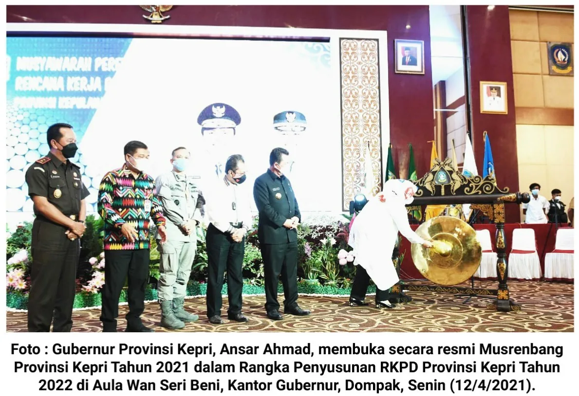 “Melalui tema ini diharapkan, segala potensi yang ada di Kepulauan Riau dapat dimaksimalkan untuk pemulihan ekonomi yang hanya dapat dicapai dengan tata kelola pemerintahan yang baik,” kata Ansar saat membuka secara resmi Musyawarah Perencanaan Pembangunan (Musrenbang) Provinsi Kepri Tahun 2021 dalam Rangka Penyusunan Rencana Kerja Pemerintah Daerah (RKPD) Provinsi Kepri Tahun 2022 di Aula Wan Seri Beni, Kantor Gubernur, Dompak, Senin (12/4/2021).
