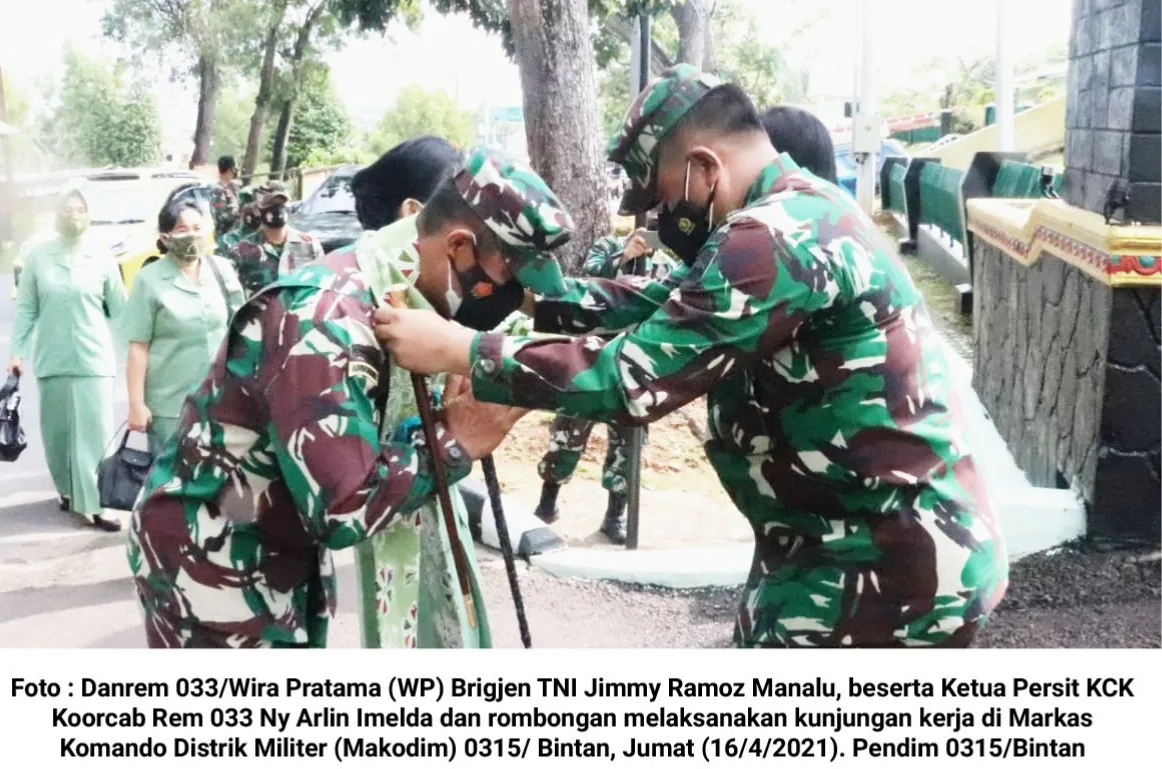 Tanjungpinang, Kepri (cMczone.com) – Komandan Resimen Militer (Danrem) 033/Wira Pratama (WP) Brigjen TNI Jimmy Ramoz Manalu, beserta Ketua Persit KCK Koorcab Rem 033 Ny Arlin Imelda dan rombongan melaksanakan kunjungan kerja (kunker) di Markas Komando Distrik Militer (Makodim) 0315/ Bintan, Jumat (16/4/2021).