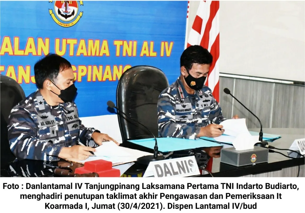 Tanjungpinang (Kepri) cMczone.com – Komandan Pangkalan Utama TNI Angkatan Laut IV (Danlantamal IV) Tanjungpinang Laksamana Pertama TNI Indarto Budiarto, menghadiri penutupan taklimat akhir Pengawasan dan Pemerikasaan Inspektorat Komando Armada I (It Koarmada I) yang berlangsung di Ruang Rapat Markas Komando (Mako) Lantamal IV, Jalan Yos Sudarso, No.1, Batu Hitam, Kota Tanjungpinang, Provinsi Kepulauan Riau (Kepri), Jumat (30/4/2021).