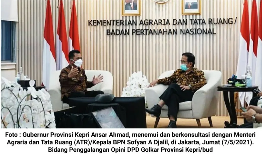 Jakarta, cMczone.com – Untuk mempercepat proses pengintegrasian Rencana Tata Ruang Wilayah (RTRW) dan Rencana Zonasi Wilayah Pesisir dan Pulau–Pulau Kecil (RZWP3K) di Kepulauan Riau (Kepri) sebagai amanat UU Cipta Kerja dan PP 21 Tahun 2021 tentang Penyelenggaraan Penataan Ruang, Gubernur Provinsi Kepri Ansar Ahmad, menemui dan berkonsultasi dengan Menteri Agraria dan Tata Ruang (ATR)/BPN Sofyan A Djalil, di Jakarta, Jumat (7/5/2021).