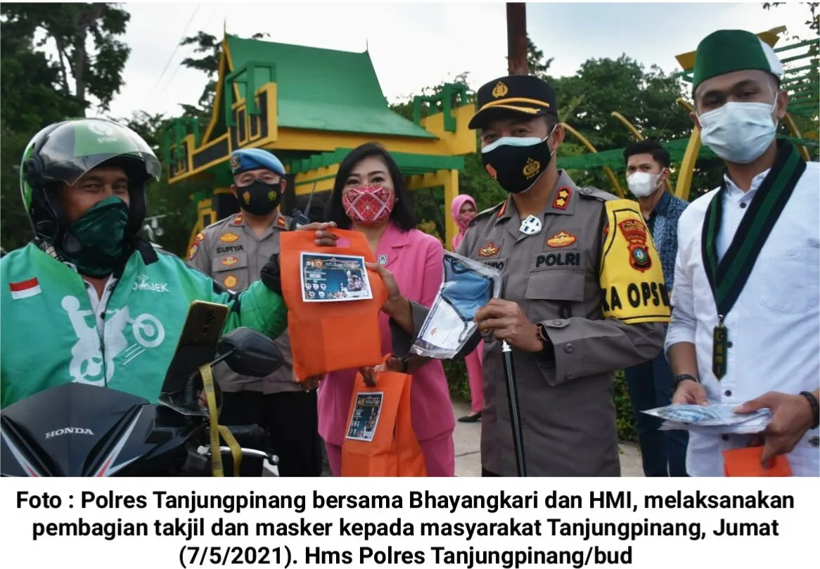 Tanjungpinang (Kepri), cMczone.com – Sebagai wujud kepedulian sekaligus berbagi di Bulan Suci Ramadan 1442 H, Kepolisian Resor (Polres) Tanjungpinang bersama Bhayangkari dan Himpunan Mahasiswa Islam (HMI) melaksanakan pembagian takjil dan masker kepada masyarakat Tanjungpinang, Jumat (7/5/2021).