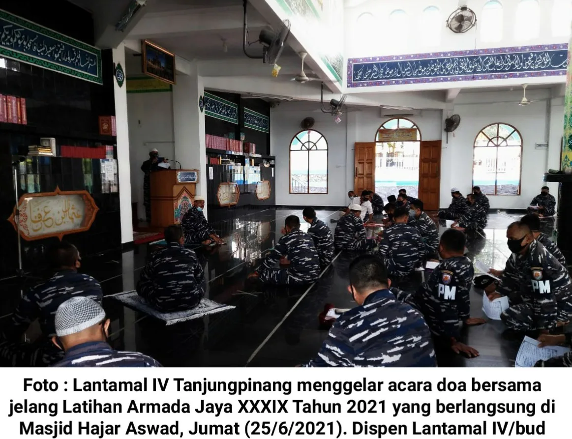Tanjungpinang (Kepri), cMczone.com – Lantamal IV Tanjungpinang menggelar acara doa bersama jelang Latihan Armada Jaya XXXIX Tahun 2021 yang berlangsung di Masjid Hajar Aswad bagi umat Muslim dan bagi umat Nasrani di Aula Denma Mako Lantamal IV, Jalan Yos Sudarso, No.1, Batu Hitam, Kota Tanjungpinang, Provinsi Kepulauan Riau (Kepri), Jumat (25/6/2021).