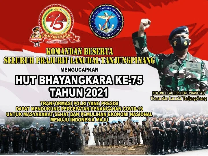 Ucapan yang bertuliskan Komandan Lanudal Tanjungpinang beserta Seluruh Prajurit mengucapkan Dirgahayu Bhayangkara Ke-75 tahun 2021 tersebut bertemakan “Transformasi Polri yang Presisi dapat Mendukung Percepatan Penanganan Covid-19 untuk Masyarakat Sehat dan Pemulihan Ekonomi Nasional Menuju Indonesia Maju”.