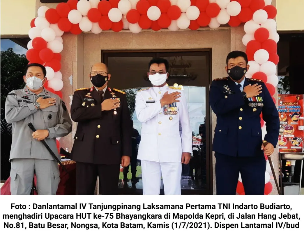 Batam (Kepri), cMczone.com – Danlantamal IV Tanjungpinang Laksamana Pertama TNI Indarto Budiarto, secara virtual menghadiri upacara Hari Ulang Tahun (HUT) ke-75 Bhayangkara di Mapolda Kepulauan Riau (Kepri) di Jalan Hang Jebat, No.81, Batu Besar, Nongsa, Kota Batam, Kamis (1/7/2021).