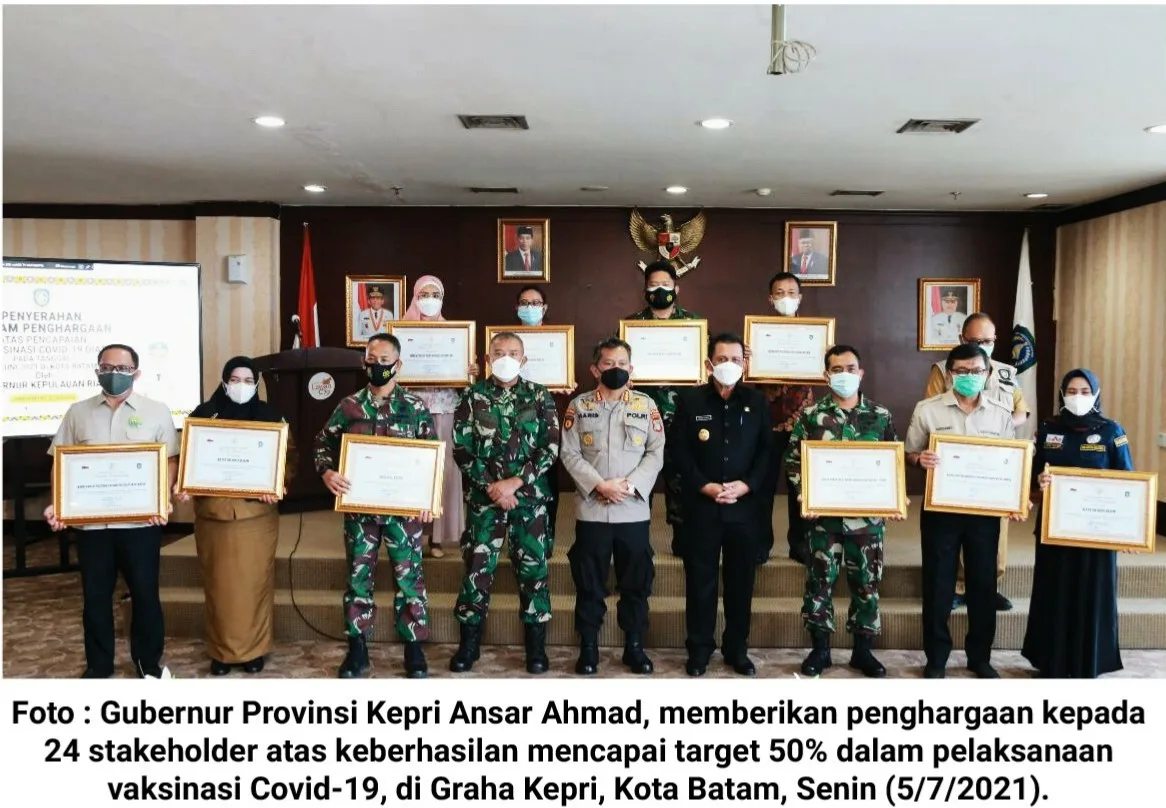 Batam (Kepri), cMczone.com – Gubernur Provinsi Kepulauan Riau (Kepri) Ansar Ahmad, memberikan penghargaan kepada 24 stakeholder atas keberhasilan mencapai target 50% dalam pelaksanaan vaksinasi Covid-19.