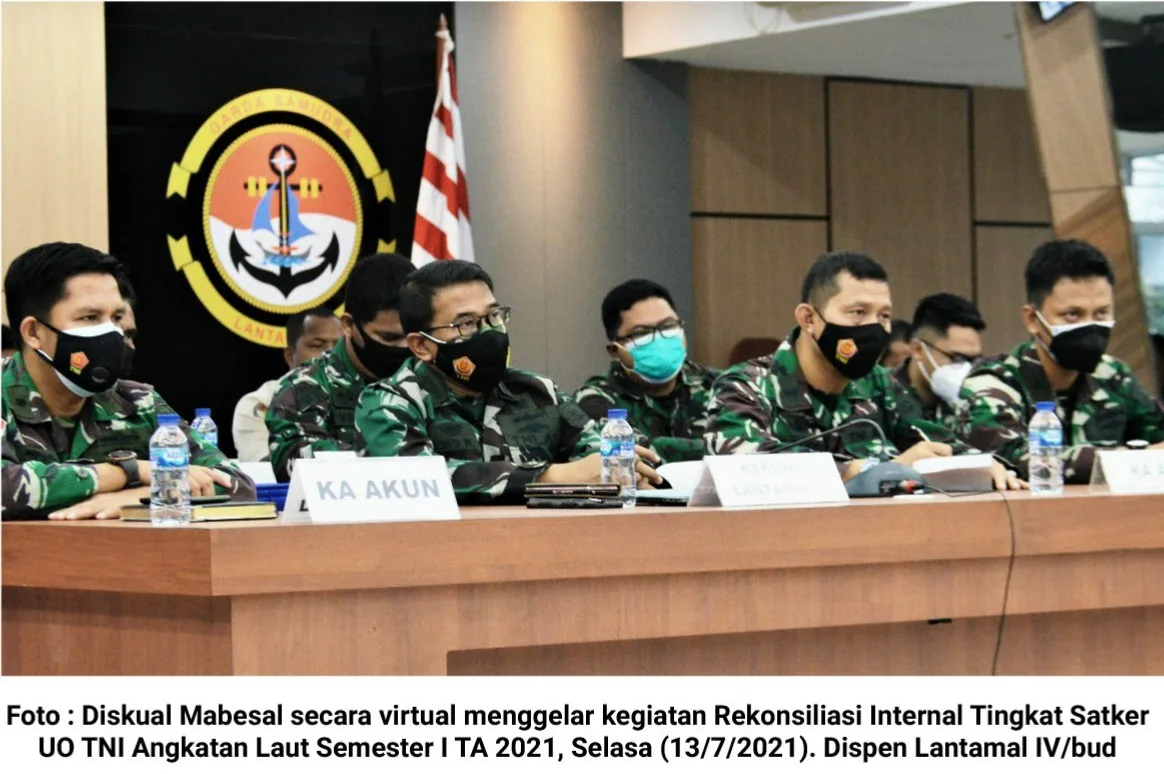 Tanjungpinang (Kepri), cMczone.com – Dinas Keuangan Angkatan Laut (Diskual) Mabesal secara virtual menggelar kegiatan Rekonsiliasi Internal Tingkat Satker Unit Organisasi (UO) TNI Angkatan Laut Semester I TA 2021, yang berlangsung Gedung Serba Guna (GSG) Mako Lantamal IV, Jalan Yos Sudarso, No.1, Batu Hitam, Kota Tanjungpinang, Provinsi Kepulauan Riau (Kepri), Selasa (13/7/2021).