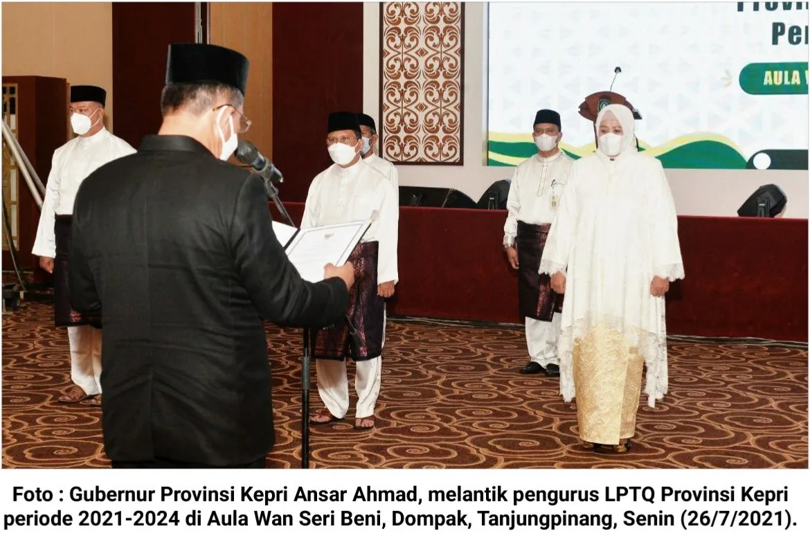 Tanjungpinang (Kepri), cMczone.com – Gubernur Provinsi Kepulauan Riau (Kepri) Ansar Ahmad, melantik pengurus Lembaga Pengembangan Tilawatil Qur’an (LPTQ) Provinsi Kepri periode 2021-2024 di Aula Wan Seri Beni, Dompak, Tanjungpinang, Senin (26/7/2021).